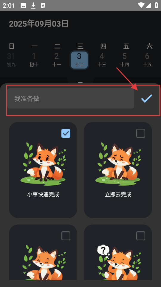 4、添加待办时,在输入框写要做的事,比如【我准备做...】,写好后点√,完成待办添加。
