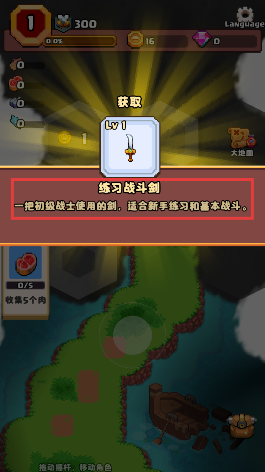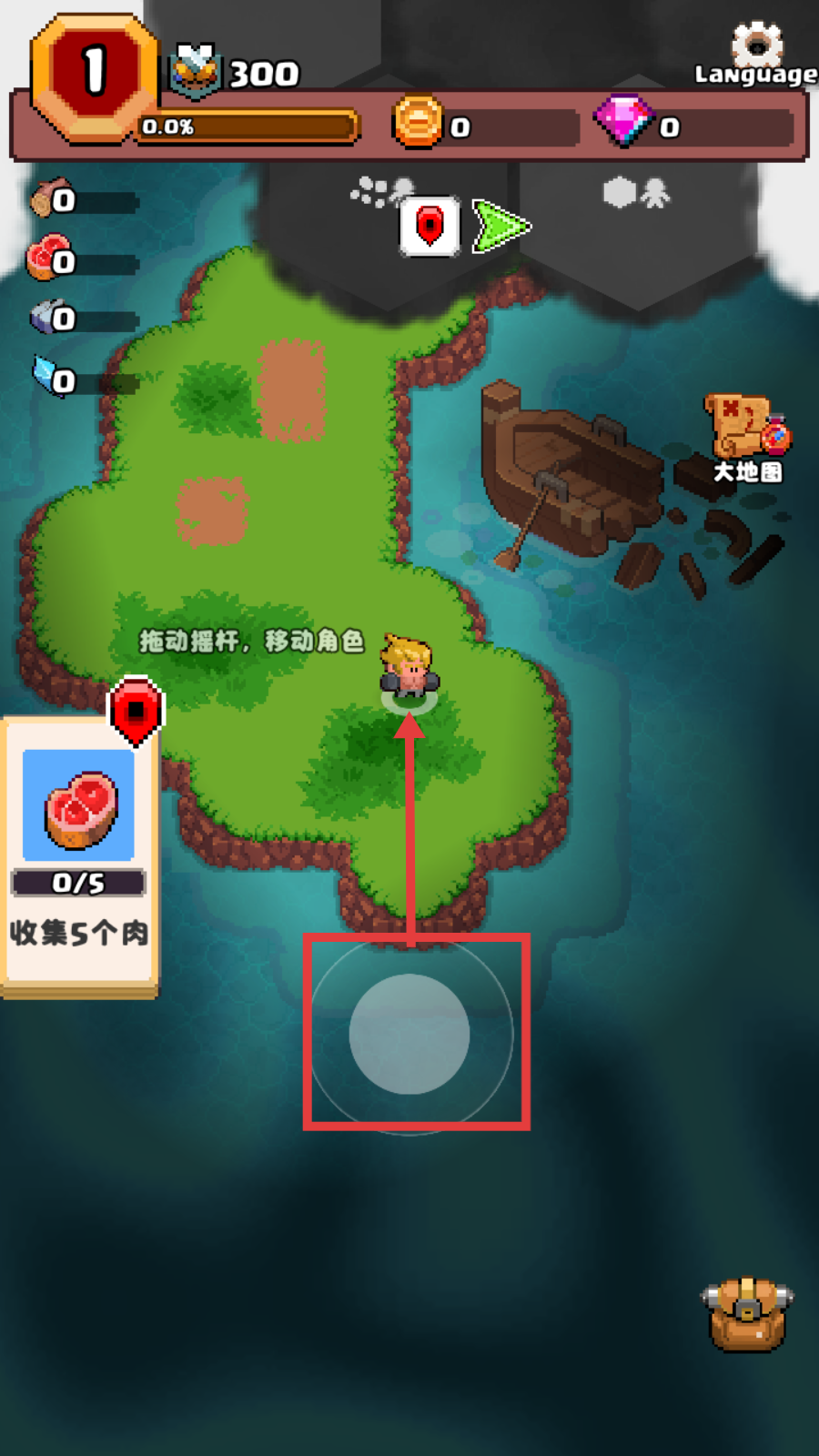 1、进游戏先学操作,按【拖动摇杆,移动角色】提示操控,同时推进【收集5个肉-0/5】的任务。