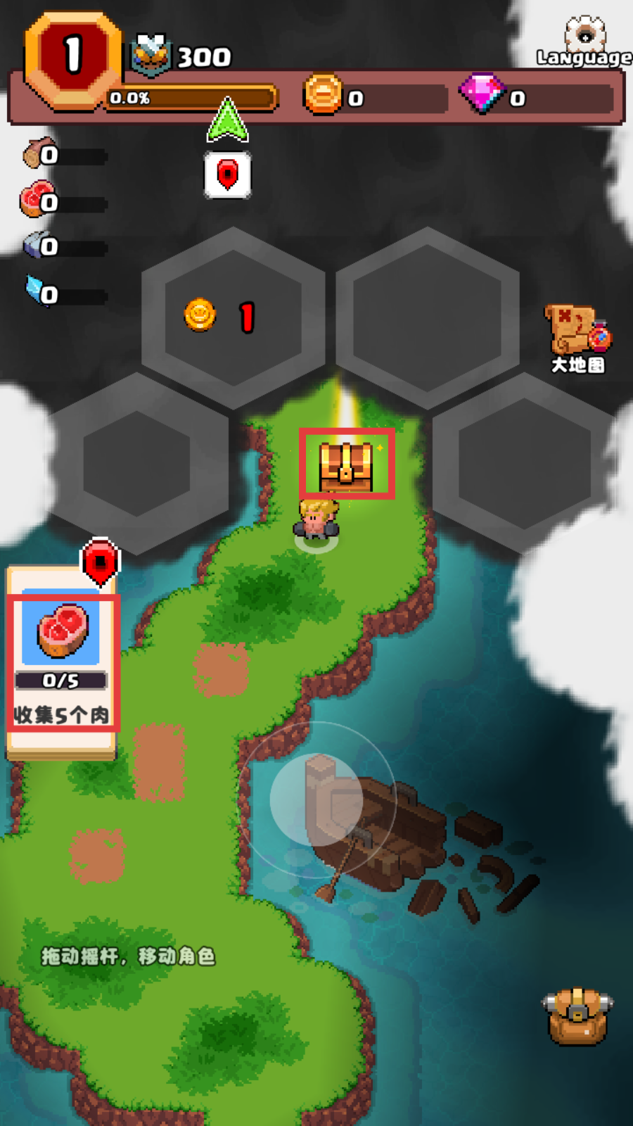 2、移动角色到宝箱处,打开能获得金币,别忘了左侧【收集5个肉-0/5】的任务仍要推进。