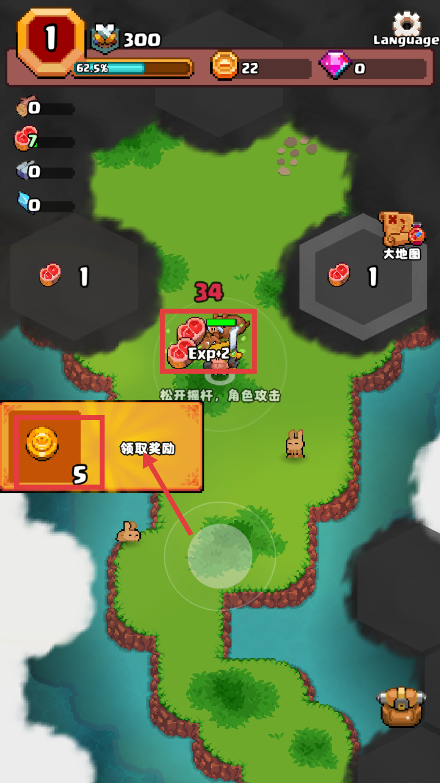 4、战斗时按【松开摇杆,角色攻击】操作,打怪能得经验和肉,完成后记得领取【奖励-5】金币。