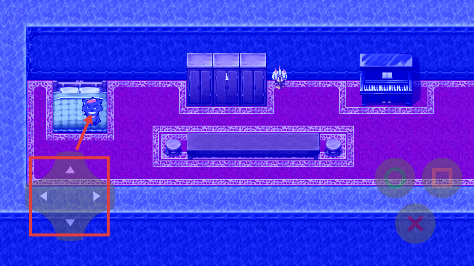 1、用左下角方向键操控角色,移动到有灰太狼形象的床铺区域,探索初始场景里的关键位置。