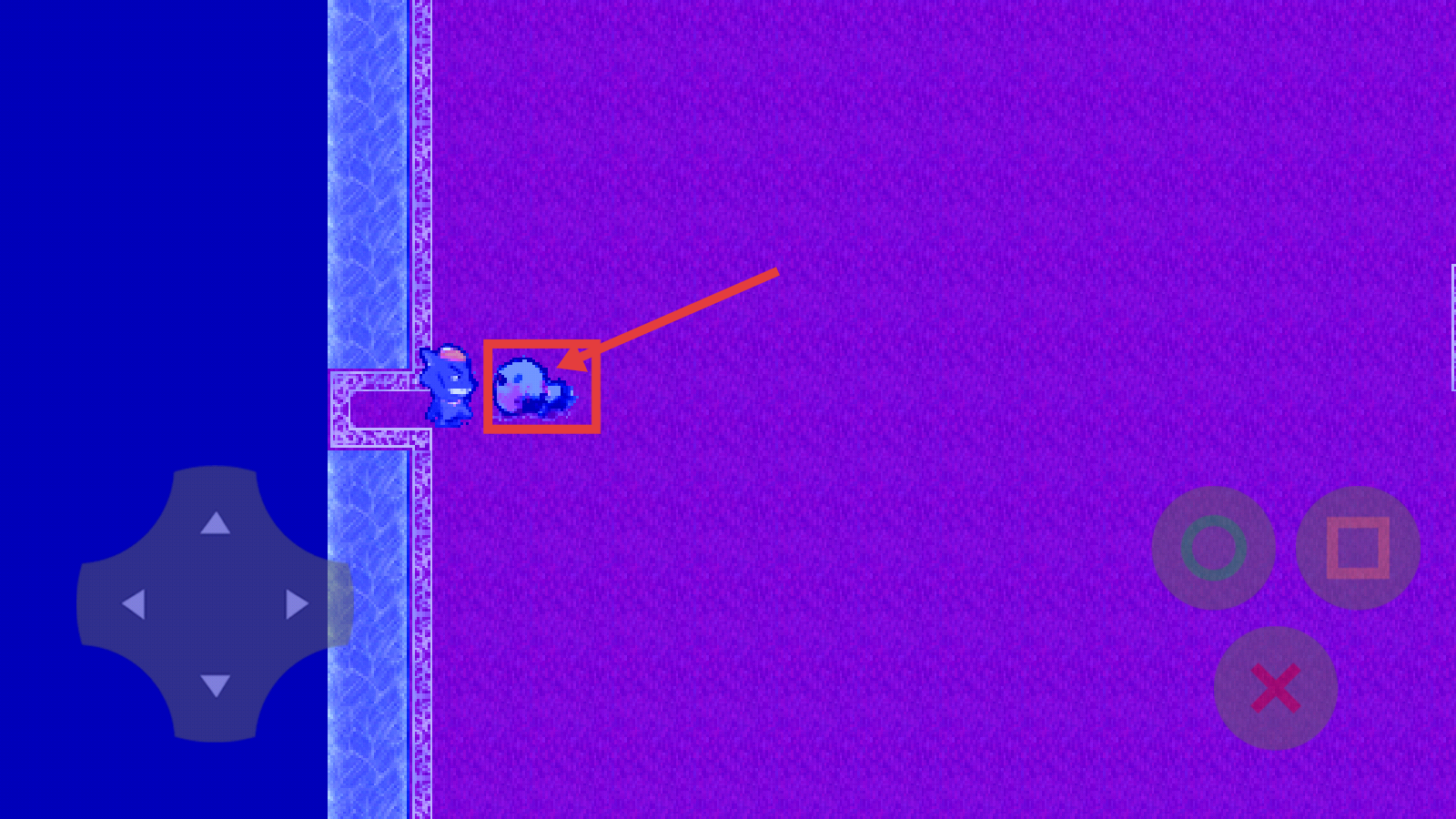4、操控角色移动到紫色地面上的蓝色小角色处,与其交互,推进游戏后续的剧情或任务。