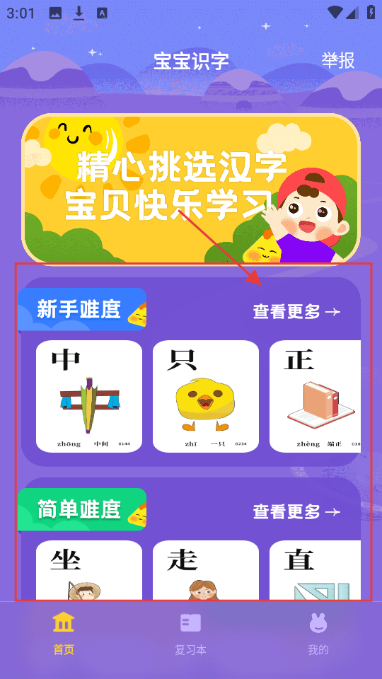 1、进入首页,有【新手难度】【简单难度】等,选【新手难度】旁的【查看更多】,看更多新手难度汉字。