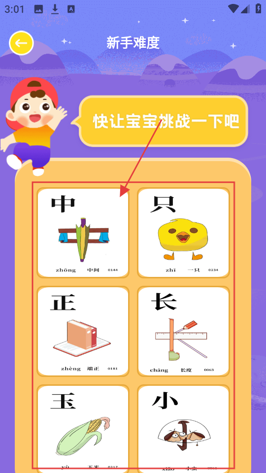 2、进入新手难度页,有【中】【只】【正】等汉字,选要学习的汉字,开始学习其读音和含义。