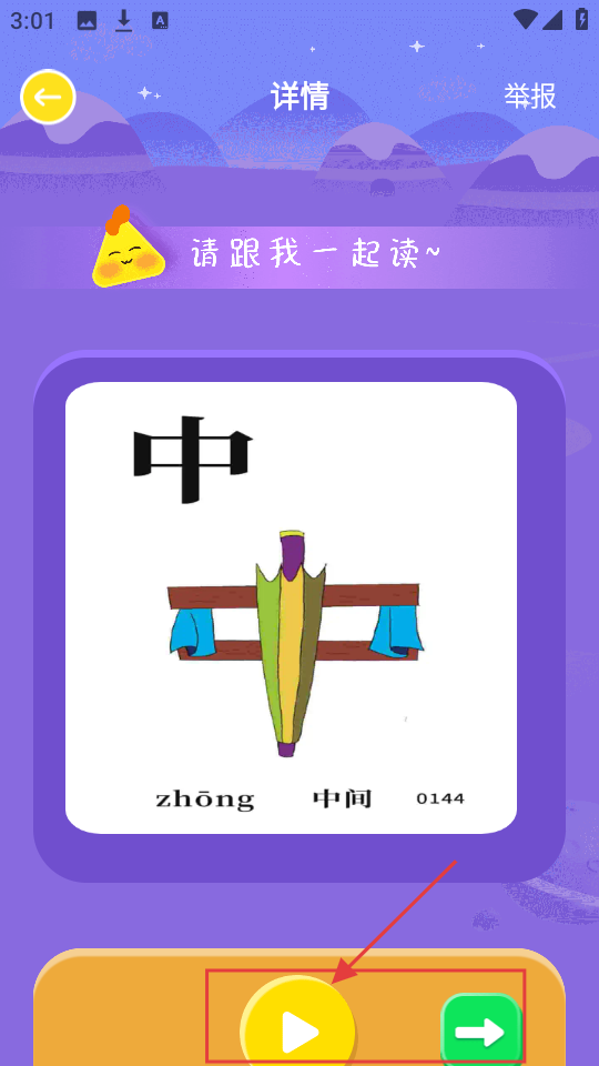 3、在汉字【中】的详情页,看汉字、拼音【zhōng】和含义【中间】,点播放按钮,听读音跟读学习。
