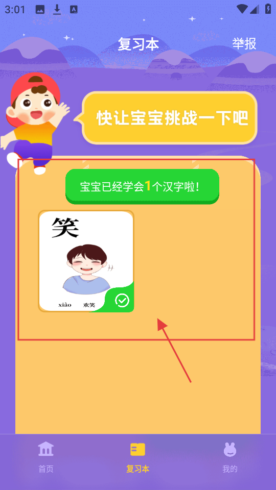4、在复习本页,能看到已学会的汉字,如【笑-xiào-欢笑】,可复习巩固已学汉字,加深记忆。