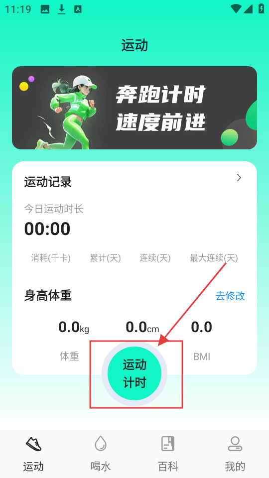 1、进入运动页,可先查看运动记录,了解今日运动时长等,若要运动,点【运动计时】开始记录。