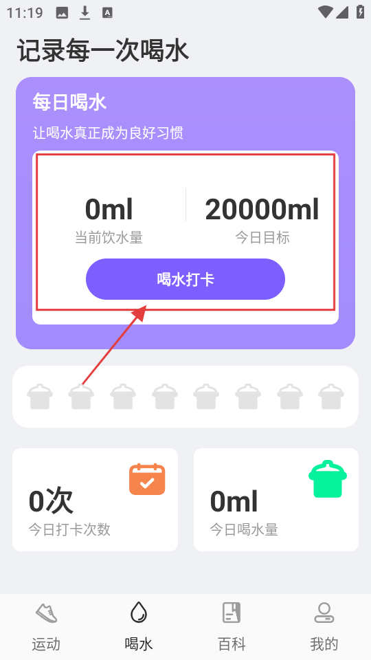 3、切换至喝水页,能看到当前饮水量和今日目标,每次喝水后,点【喝水打卡】记录饮水量。