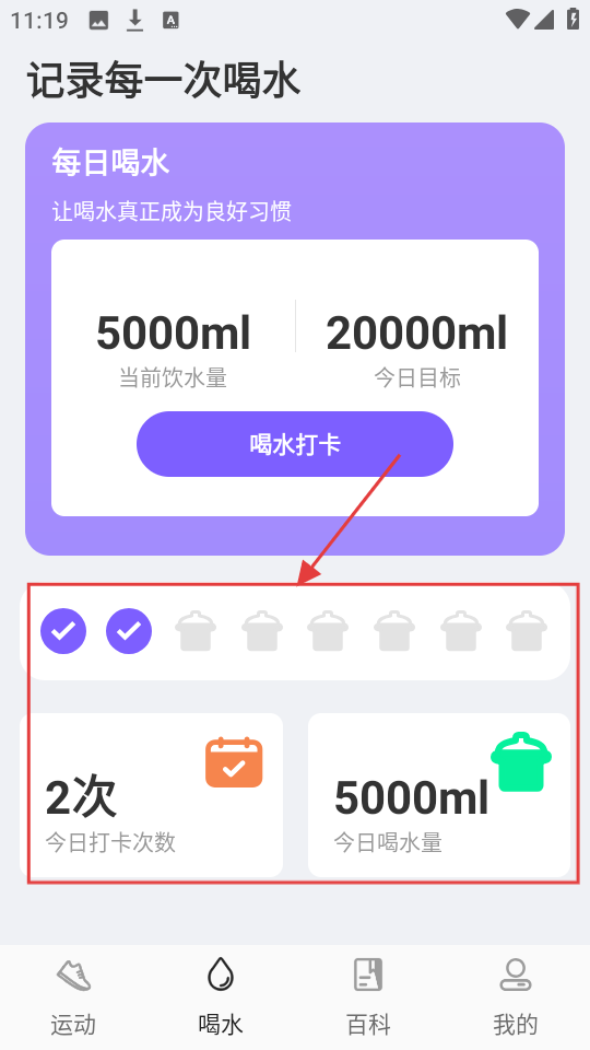 4、多次喝水打卡后,可在喝水页查看今日打卡次数和喝水量,了解饮水目标完成情况。