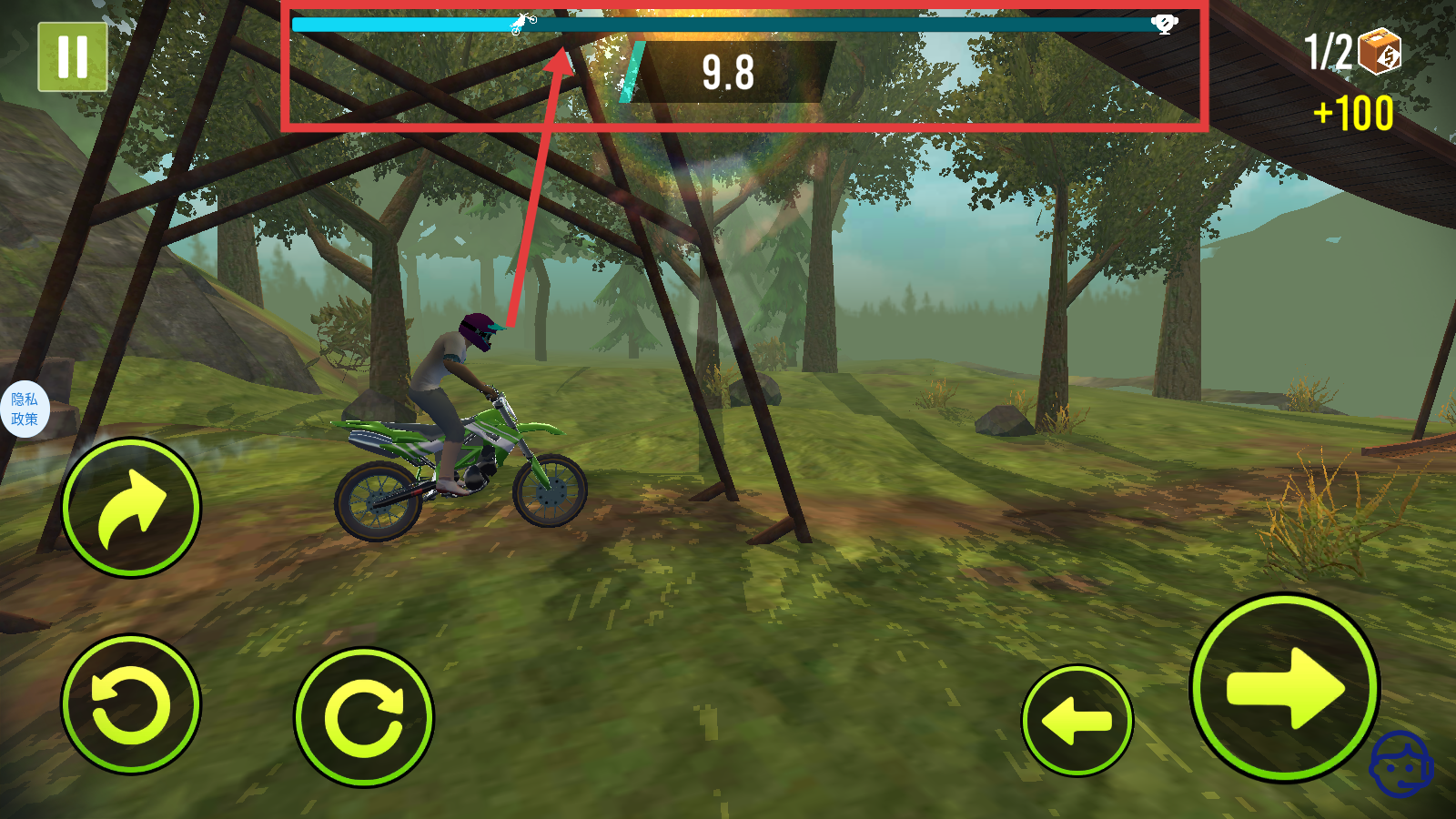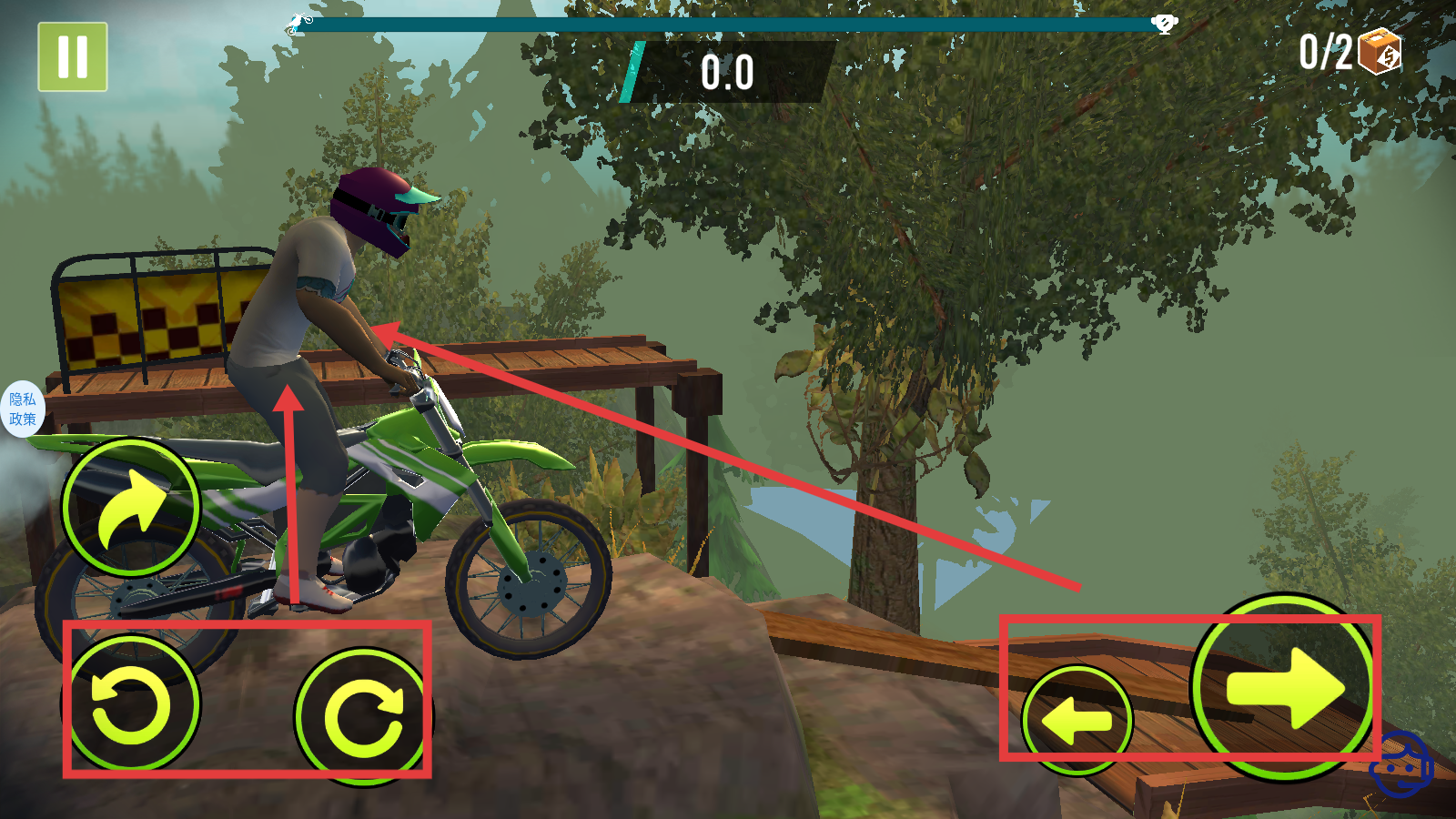 1、进入游戏后,利用左下角旋转按钮和右下角方向按钮,控制摩托车姿态与前进方向,准备开启“森林跳跃”关卡。