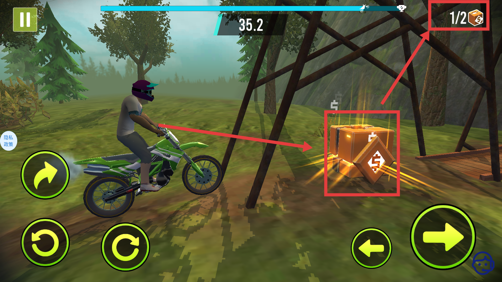 3、在场景中寻找发光的橙色箱子,操控摩托车靠近并收集,逐步完成【1/2】的箱子收集目标。