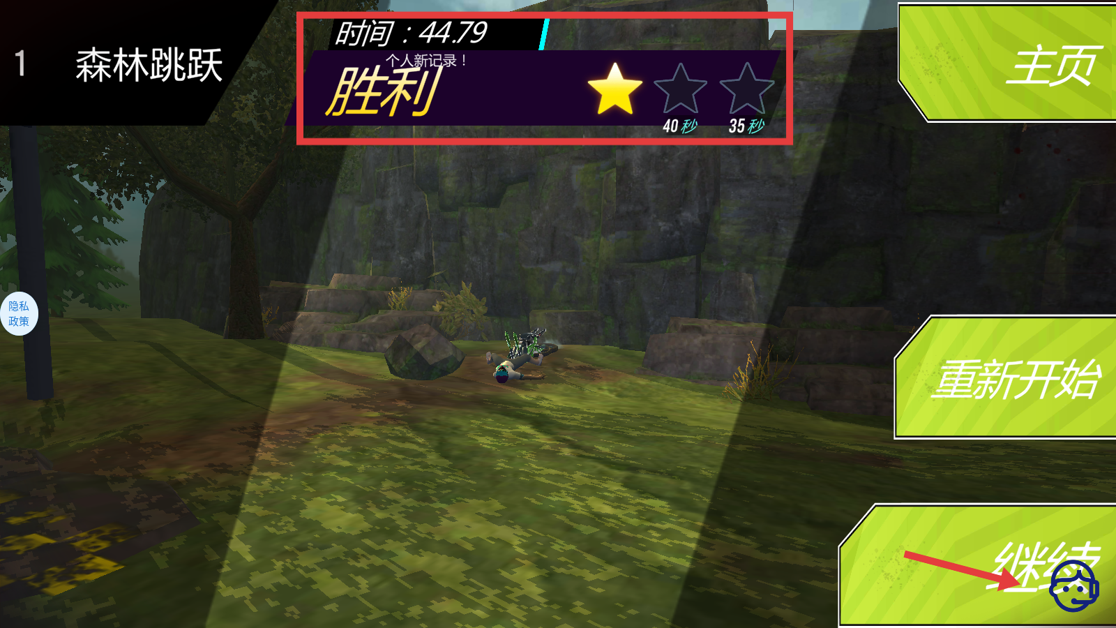 4、完成关卡后,界面显示“胜利”及星级评价,可点击【继续】按钮,挑战更多关卡或刷新个人记录。