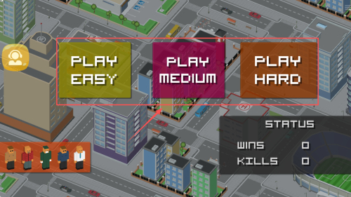 3、如何设定难度与查看战绩?点击PLAY后选ERSY、MEOIUM或HARD,注意STATUS下Wins与Kills的口内数字代表你的胜场与击杀。