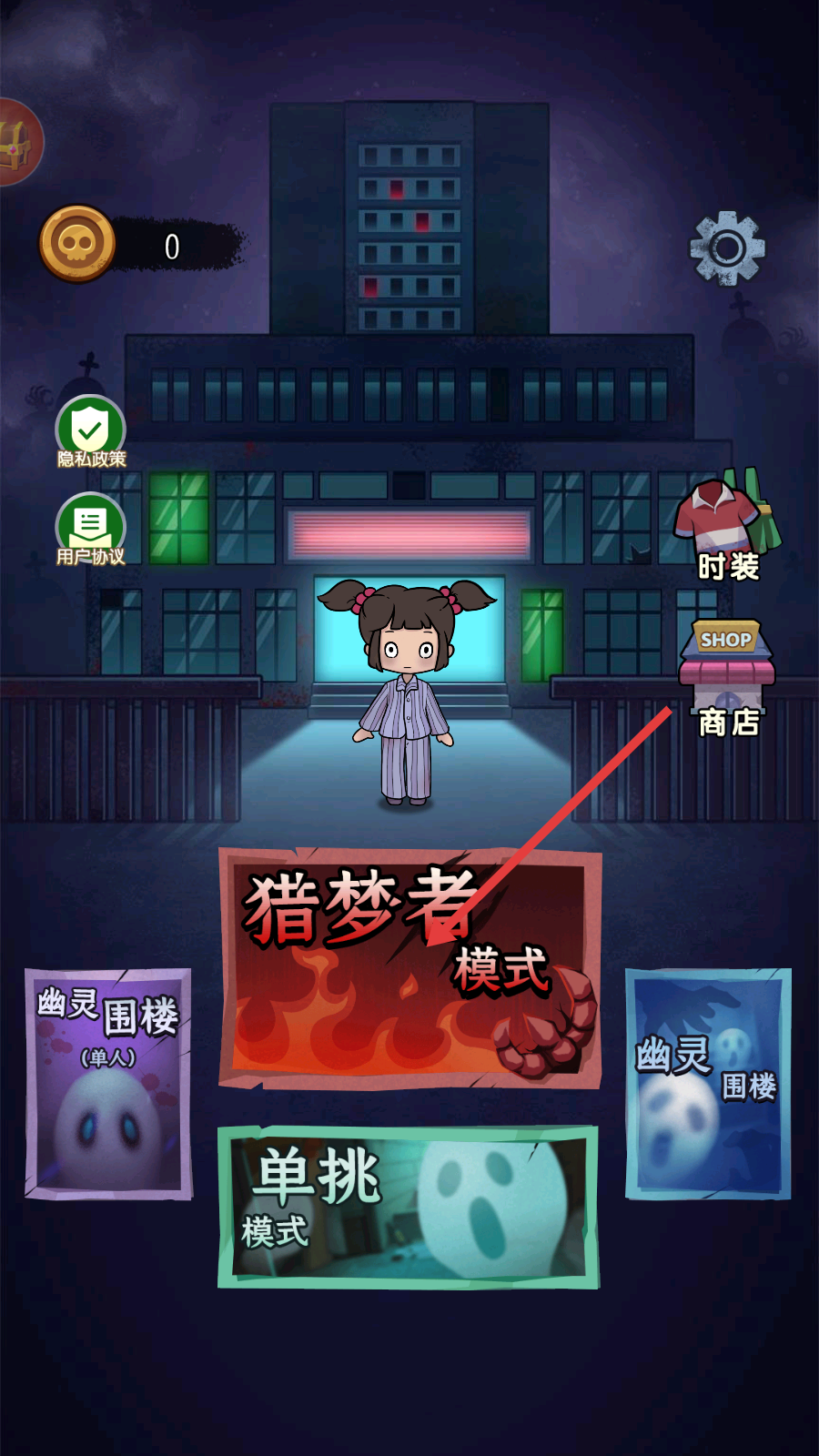 1、进入游戏后,可选择【猎梦者模式】开启挑战,也能查看【时装】或进入【商店】,先选好模式开始游戏。