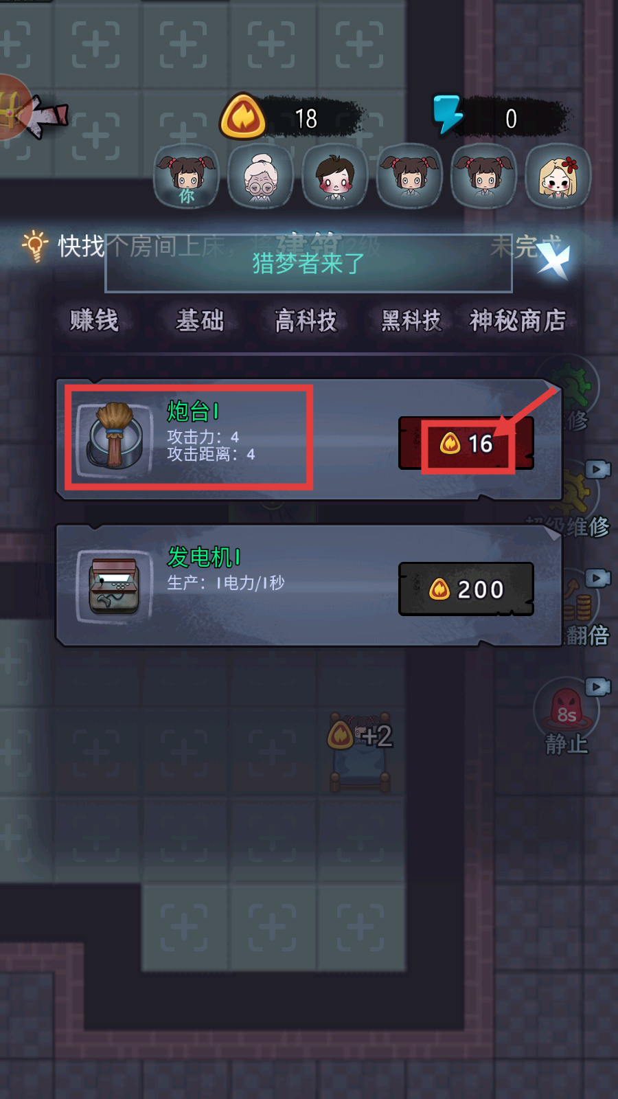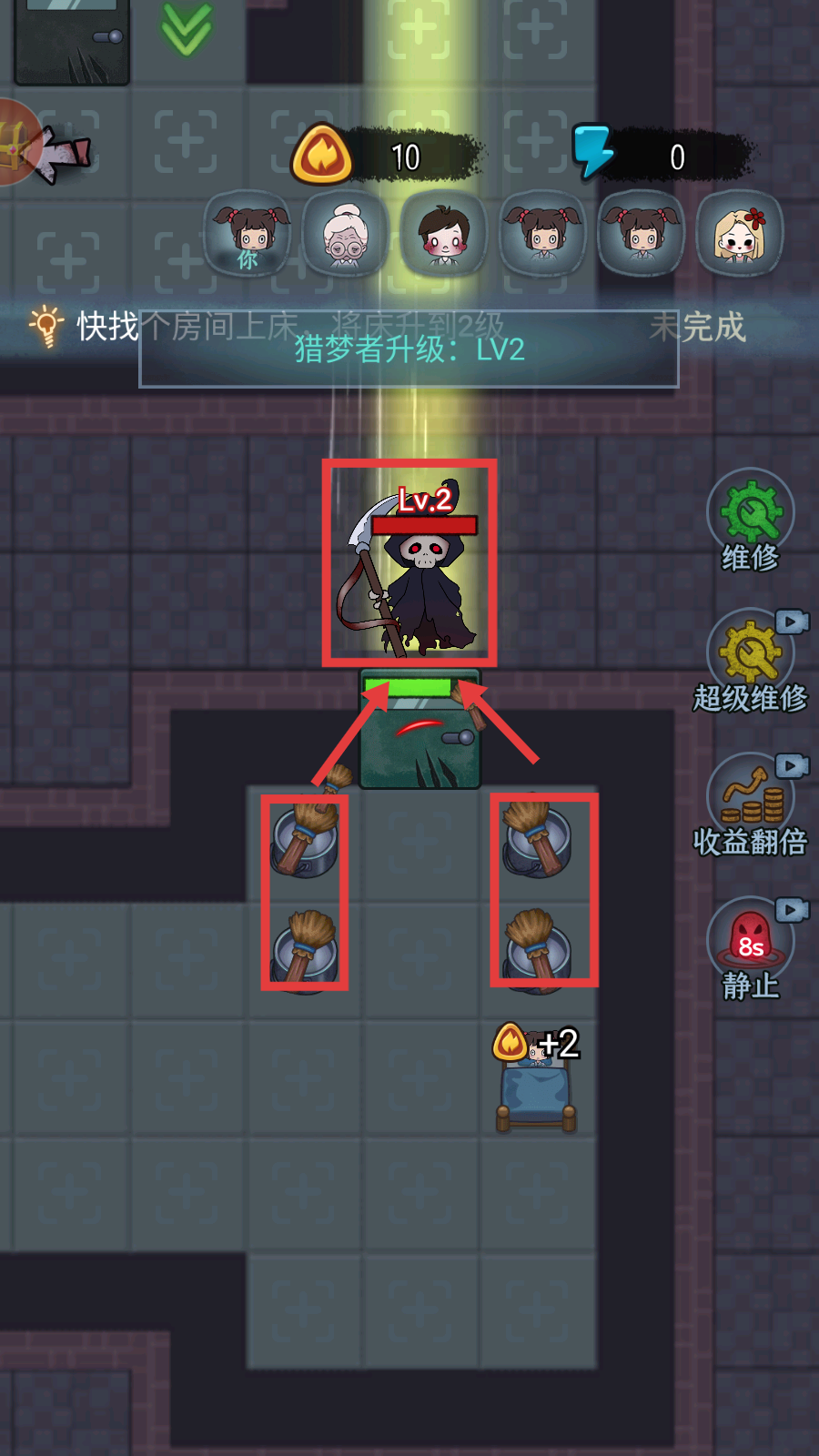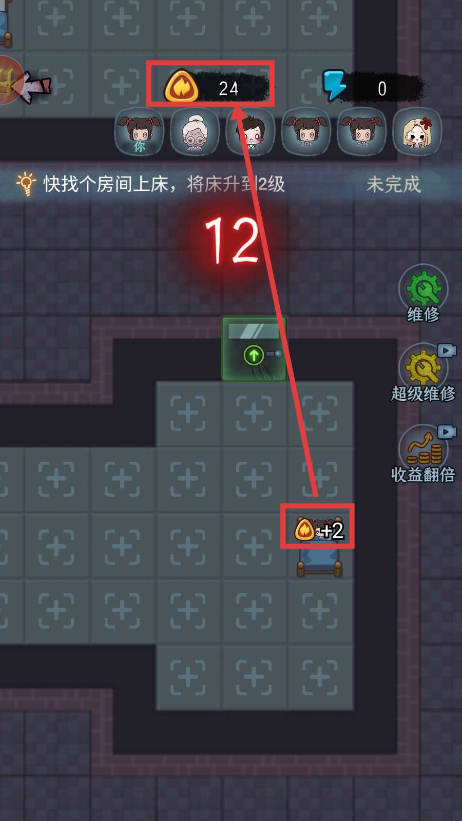 2、关卡中要关注资源获取,像床能持续获得资源,尽快找房间上床,积累资源好升级。