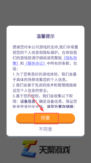 1、首先,阅读并同意游戏的隐私提示和用户协议,点击“同意”按钮以继续。