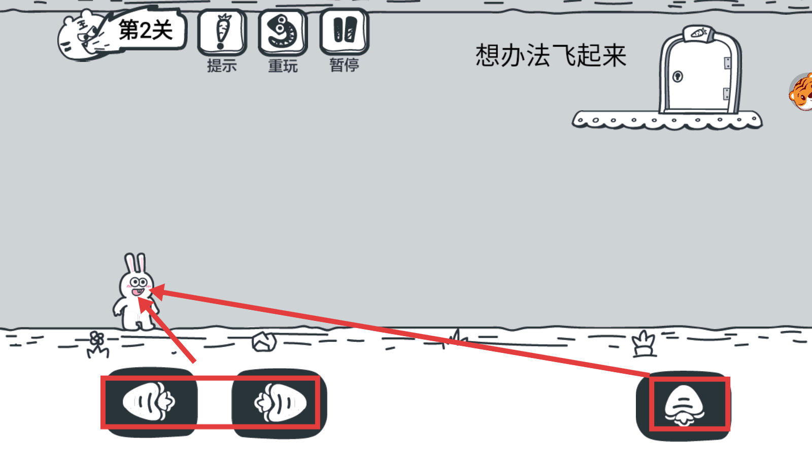 2、第2关需完成【想办法飞起来】的目标,观察场景中的兔子角色与下方道具,尝试互动推进流程。