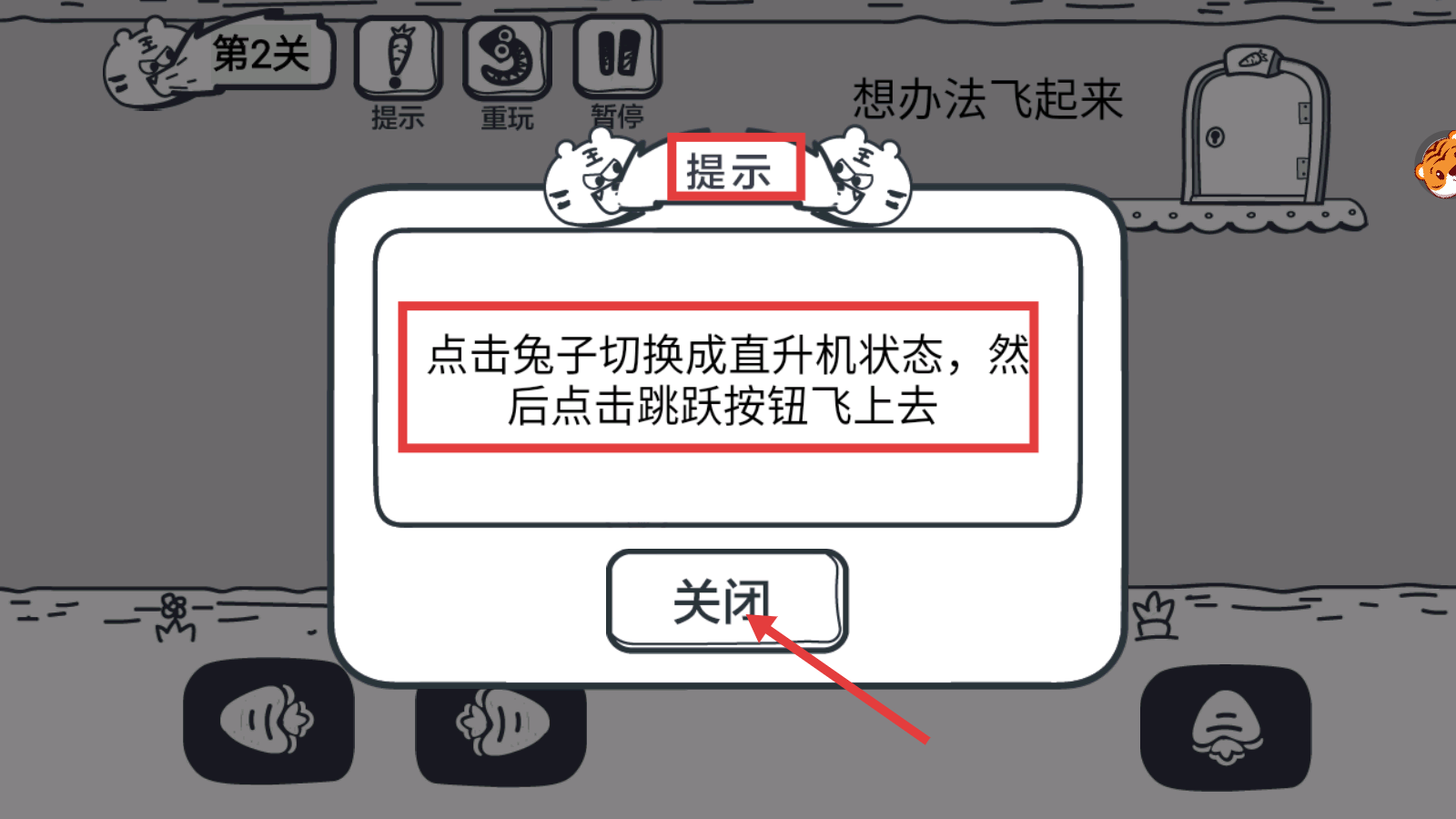 3、卡关时点击上方【提示】,按照“点击兔子切换成直升机状态-然后点击跳跃按钮飞上去”的指引操作,利用状态切换通关。