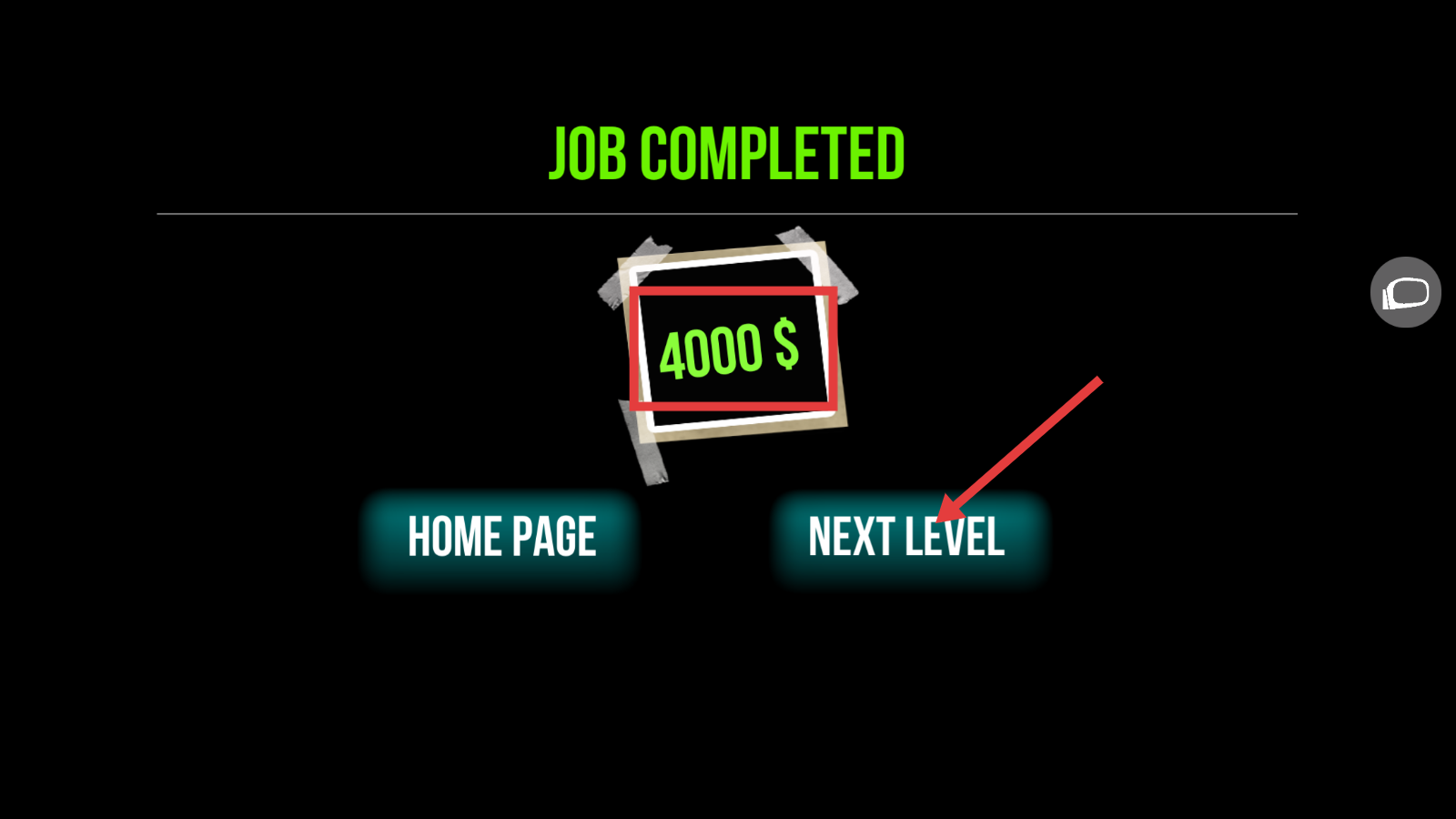 4、任务完成后界面显示【JOB-COMPLETED】和奖励【4000-$】点击【NEXT-LEVEL】进入下一关提升游戏进度。