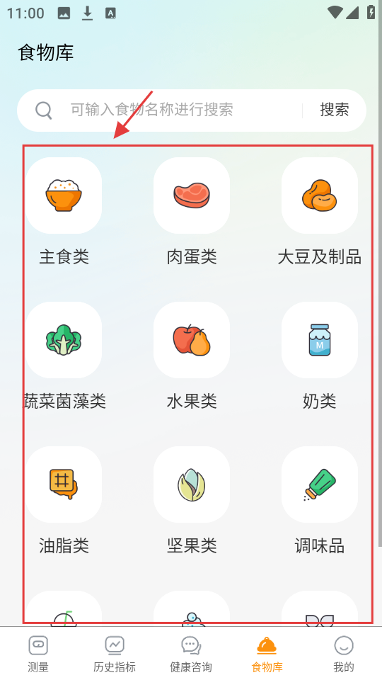 1、在食物库页,有【主食类】【肉蛋类】等分类,选对应分类,查看该类食物,了解饮食选择。