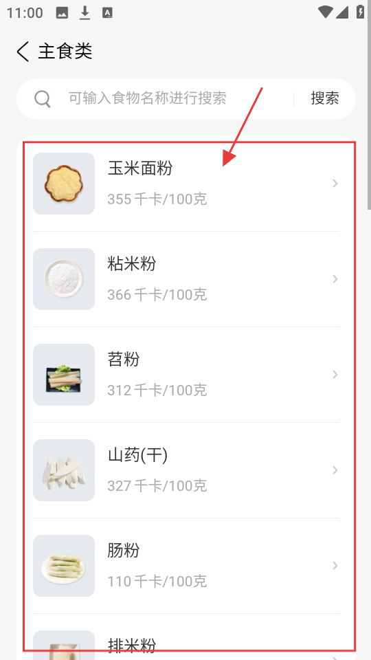 2、进入主食类页,有【玉米面粉】【粘米粉】等食物,选感兴趣食物,查看其热量等信息。