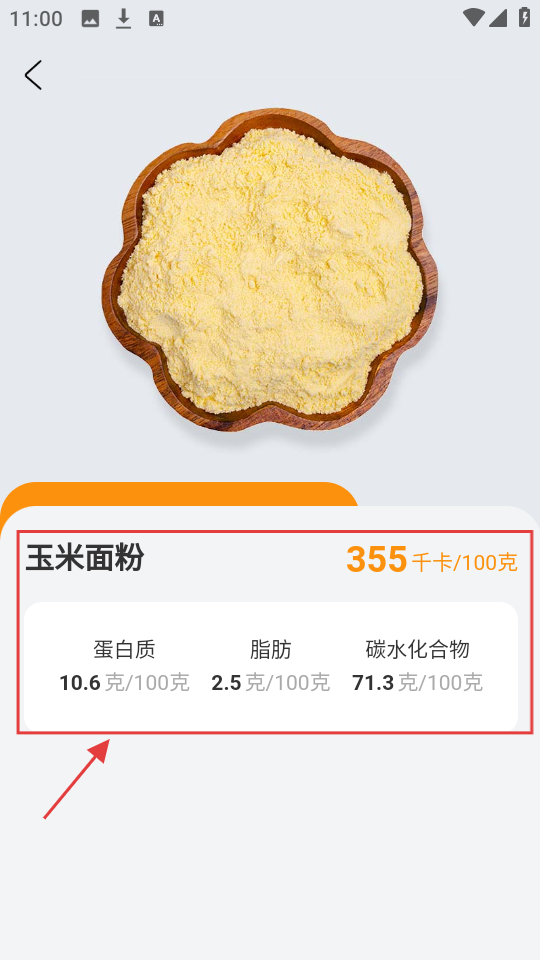 3、查看玉米面粉详情,可看其热量为【355千卡/100克】,还有蛋白质、脂肪等营养成分,了解食物营养。