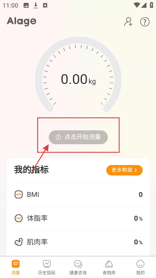 4、在测量页,点【点击开始测量】,测量体重等数据,结合食物营养,管理健康指标。