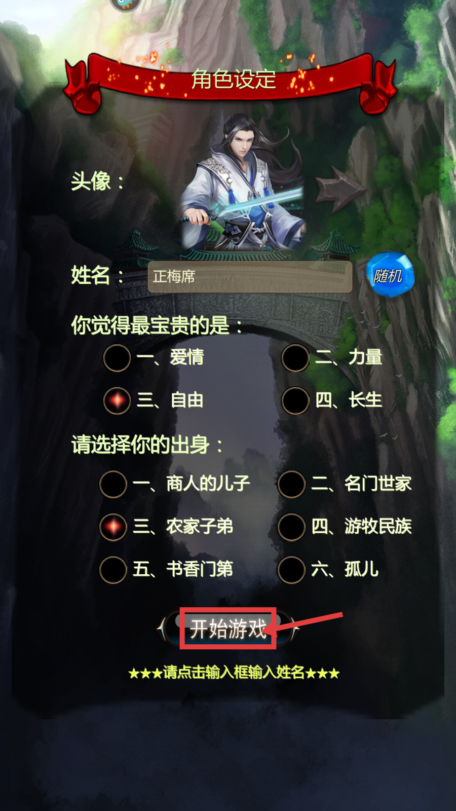 1、进入游戏先进行角色设定,选好最宝贵的事物和出身,输入姓名后点击【开始游戏】,开启修真之旅。