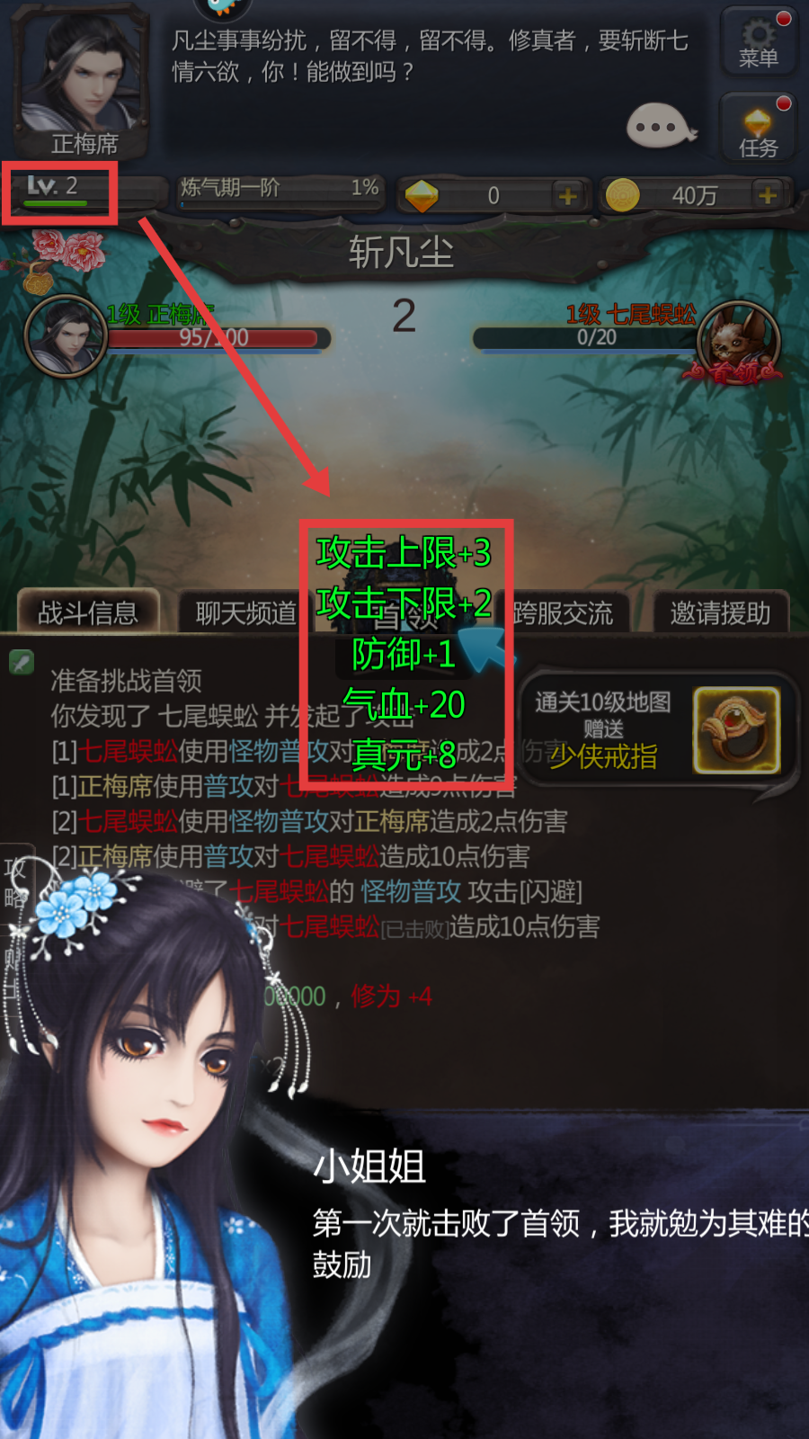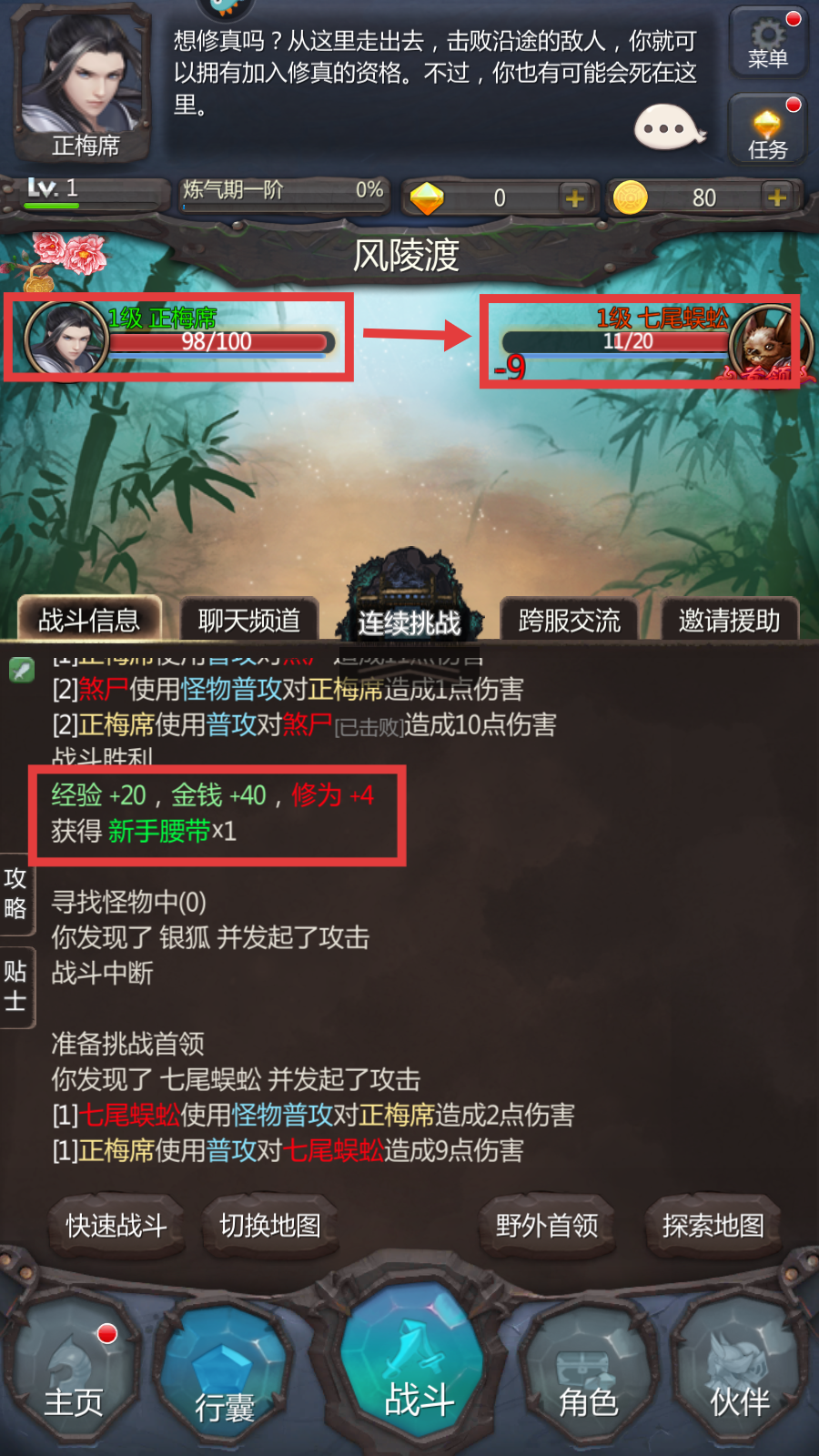 3、战斗时积极挑战怪物,像在风陵渡击败七尾蜈蚣,可获得经验、金钱、修为和新手腰带等奖励。