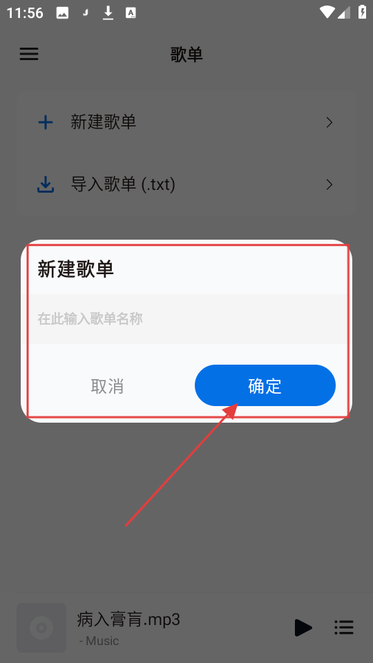 2、点【新建歌单】后,在弹出框输入歌单名称,点【确定】,完成新歌单创建,方便分类管理音乐。
