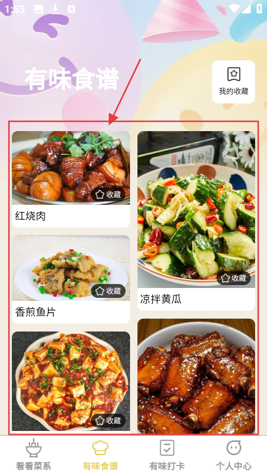 3、到有味食谱页,挑选【红烧肉】【凉拌黄瓜】【香煎鱼片】等菜品,还可点击“收藏”留存。