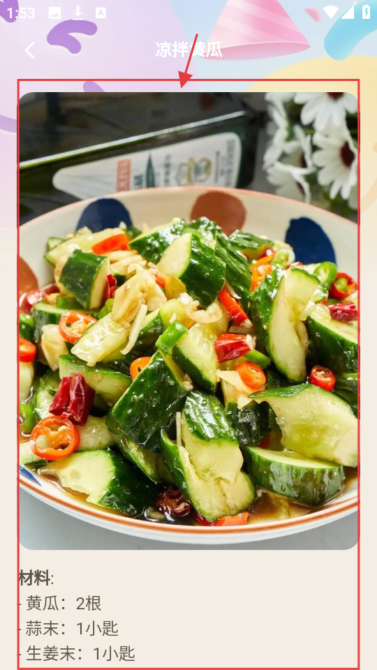 4、选好【凉拌黄瓜】后,进入详情页查看所需材料,如黄瓜-2根、蒜末-1小匙、生姜末-1小匙等。