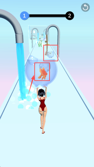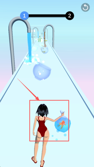 2、把控平稳前进:操控举缸小姐姐奔跑,通过轻微调整方向与速度保持平稳,避免鱼缸洒水过多,影响鱼的存活。
