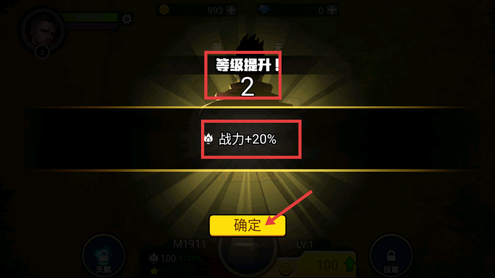 4、等级提升后,战力会得到增强,如【战力+20%】,点击【确定】继续游戏。