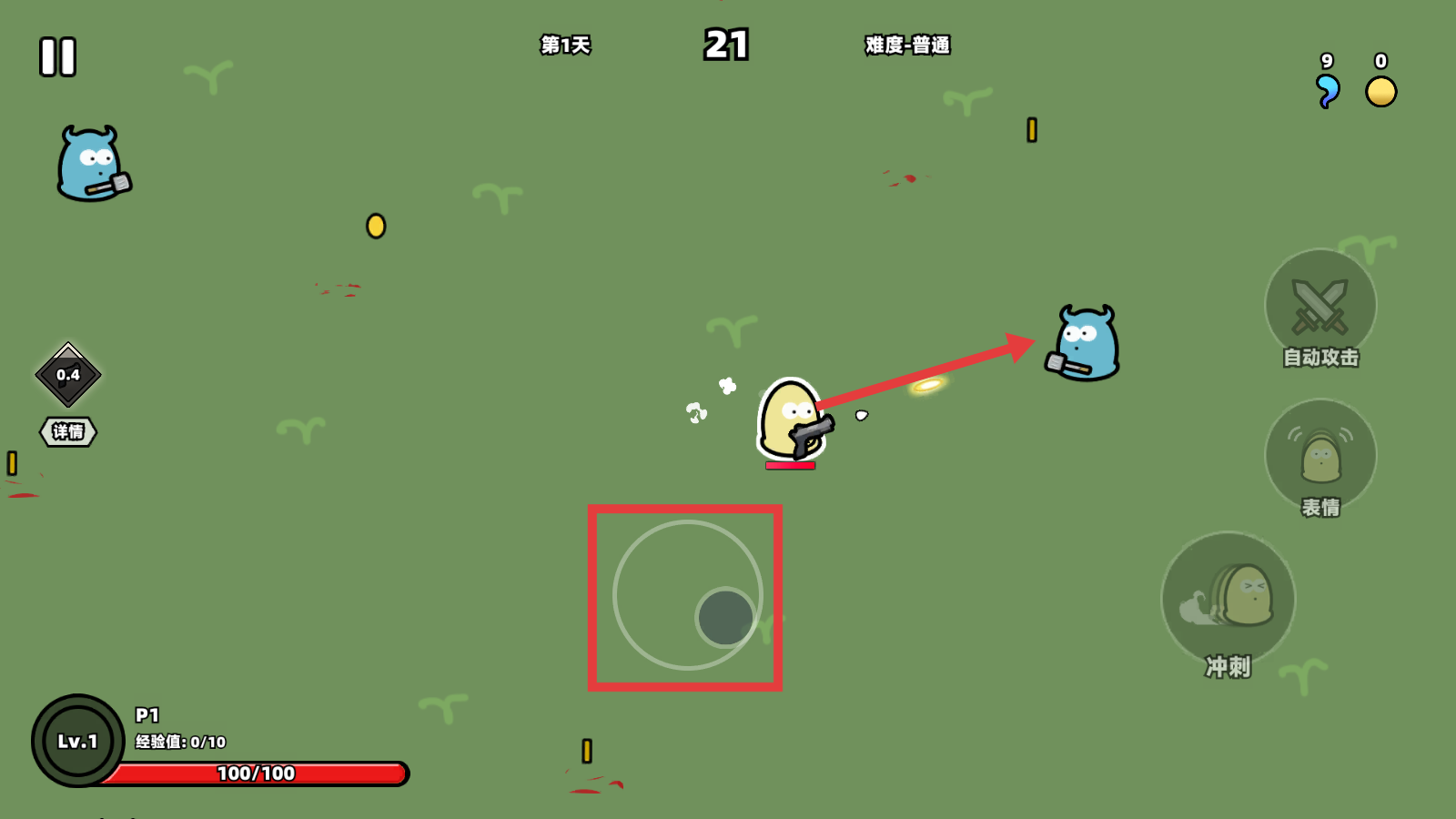 1、战斗时操控角色移动,攻击蓝色小怪,可获取金币等奖励,提升游戏进度。