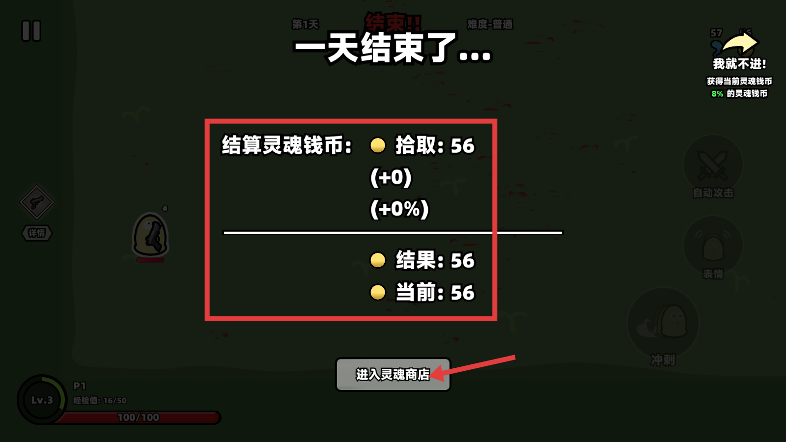 4、一天结束后,会结算灵魂钱币,可点击【进入灵魂商店】,用钱币兑换道具或强化角色。