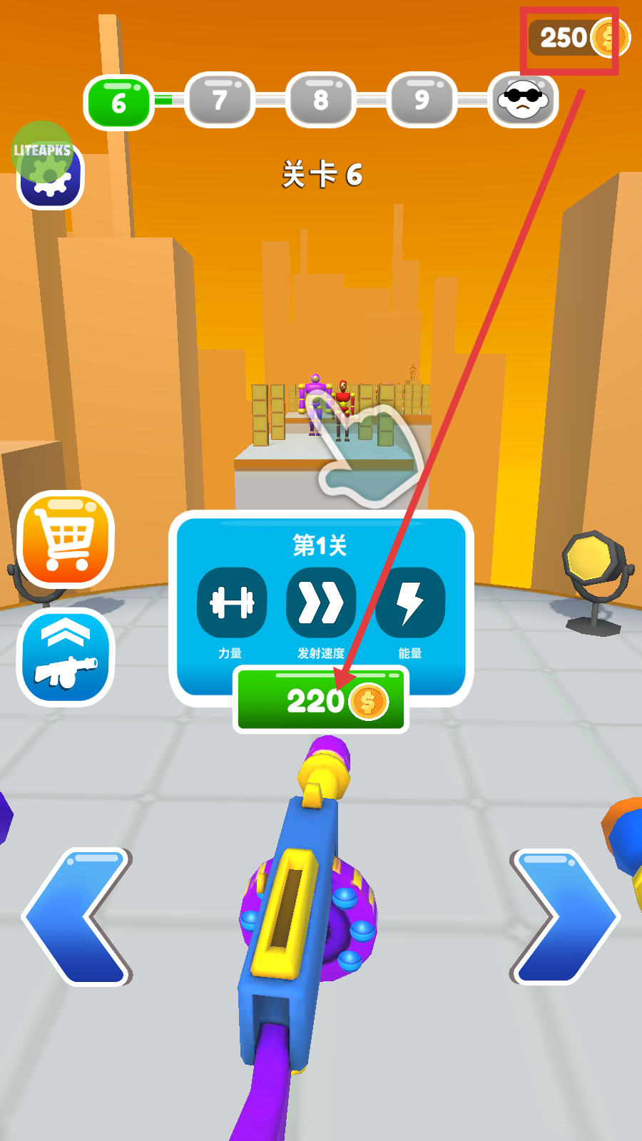 1、在关卡开始前,可花费金币提升力量、发射速度、能量等属性,增强战斗能力。
