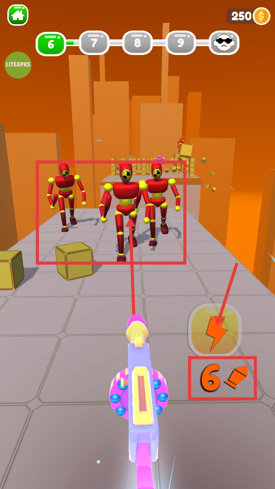 3、遇到多个敌人(如红色机器人)时,可利用技能(右侧闪电图标类技能),提升清敌效率。