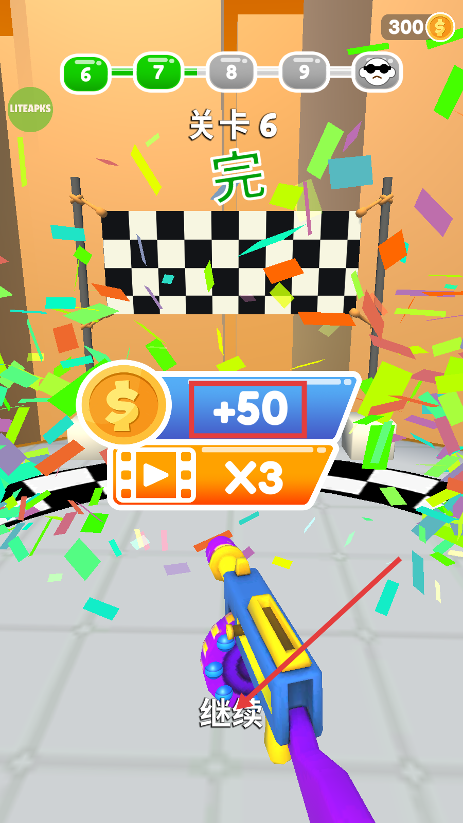 4、通关后会获得金币奖励,点击【继续】可进入下一段游戏内容,积累资源强化自身。