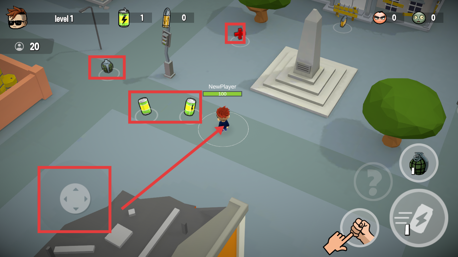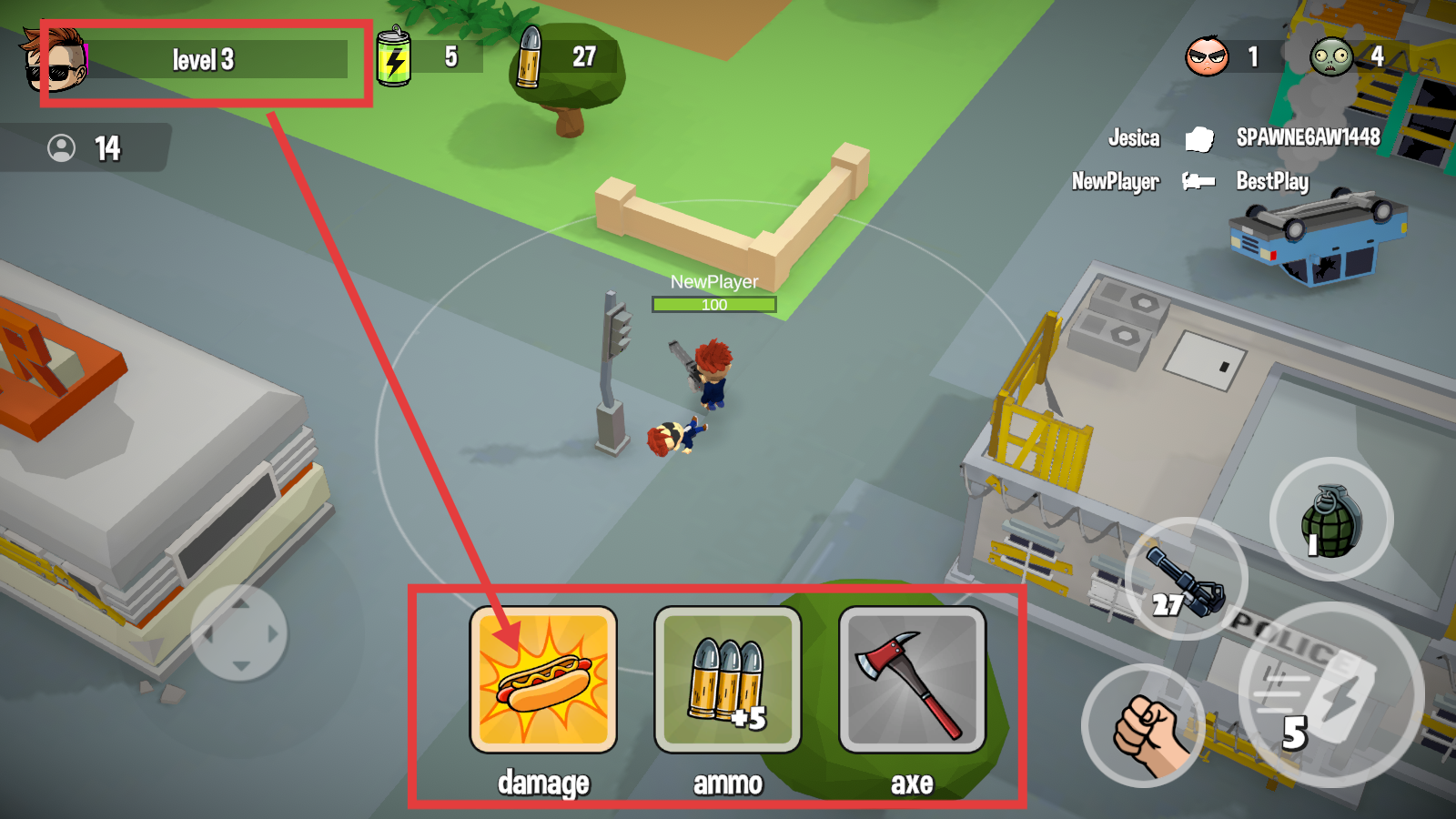 4、随着关卡提升(如到level3),可利用“damage”“ammo”“axe”等道具,增强战斗能力,更高效地应对敌人。