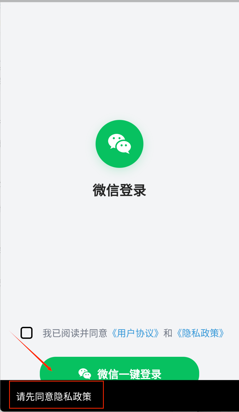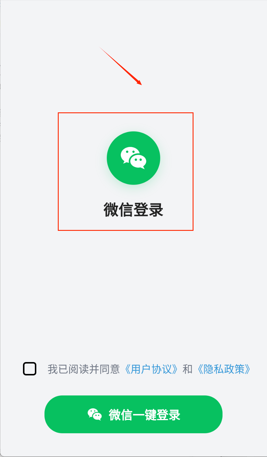 2、接着在登录界面选择微信登录方式,记得要勾选同意用户协议和隐私政策的小方框,不然点击一键登录按钮时会提示需要先同意相关条款。