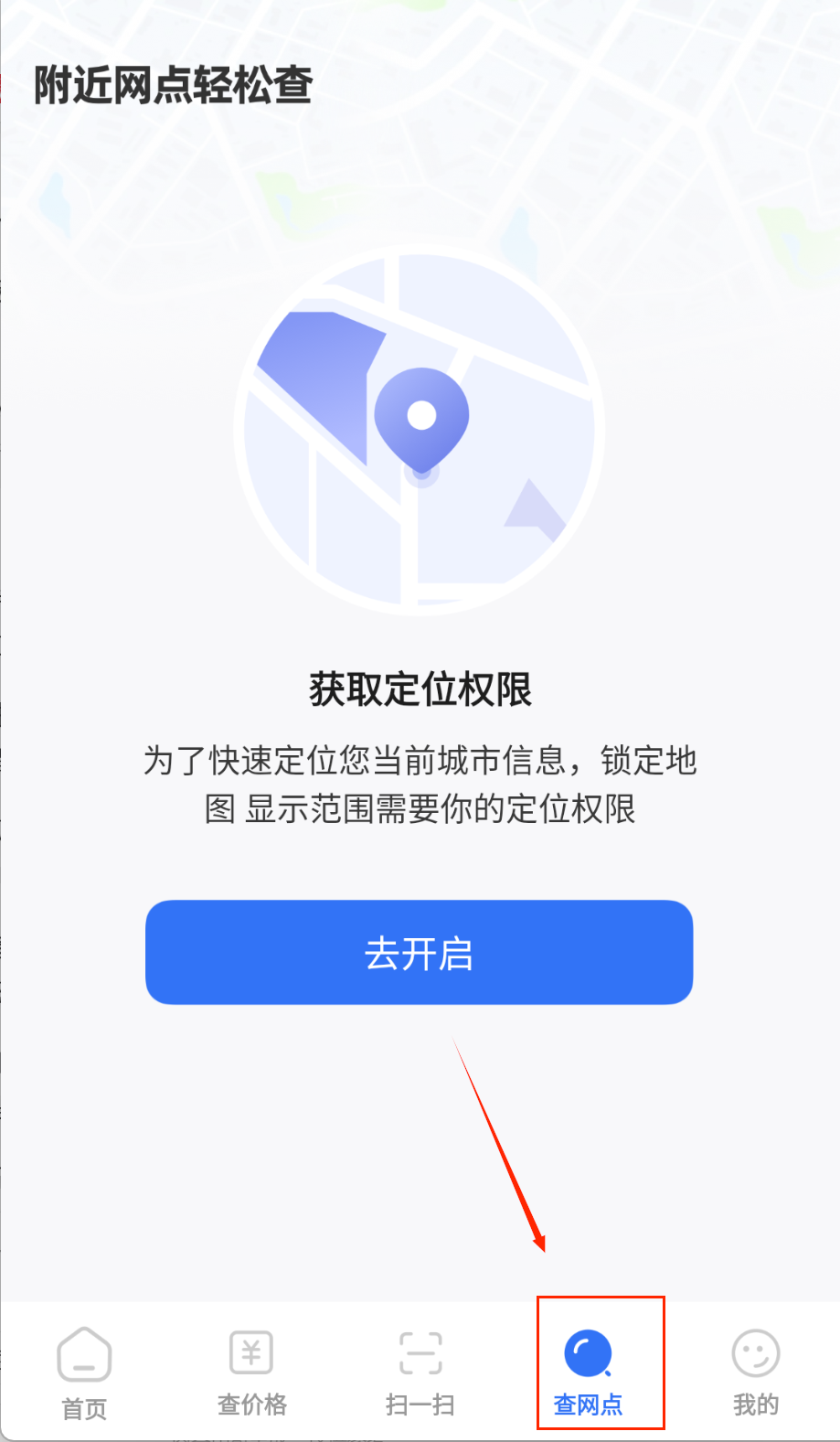 1、首次打开授予位置权限,系统自动显示附近快递网点信息,新手引导演示单号扫描与手动输入两种查询方式。