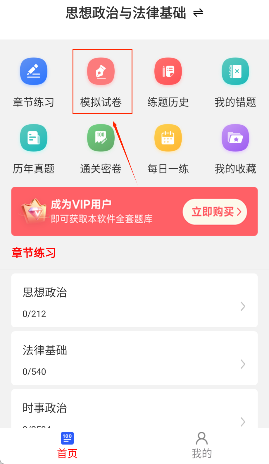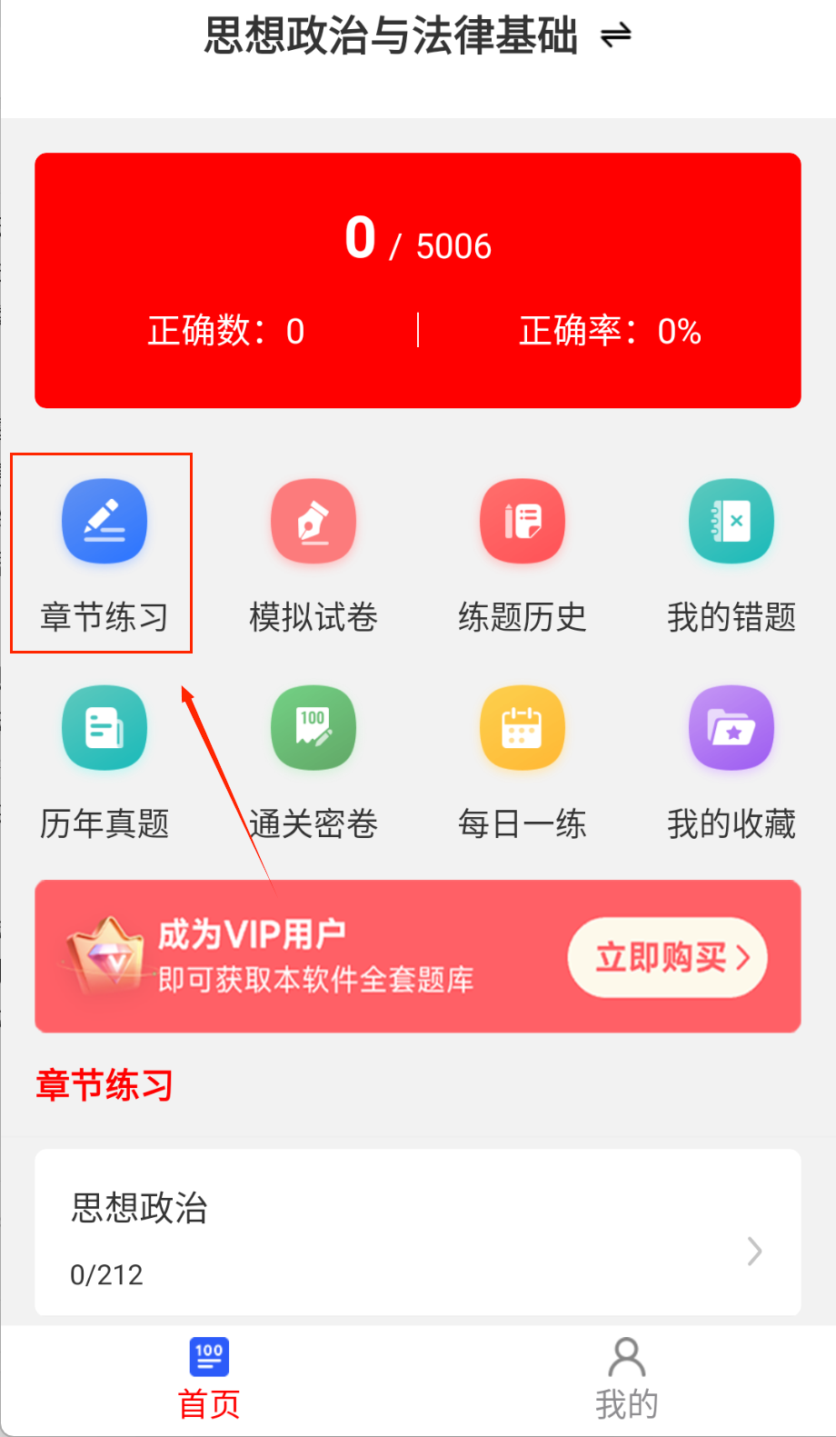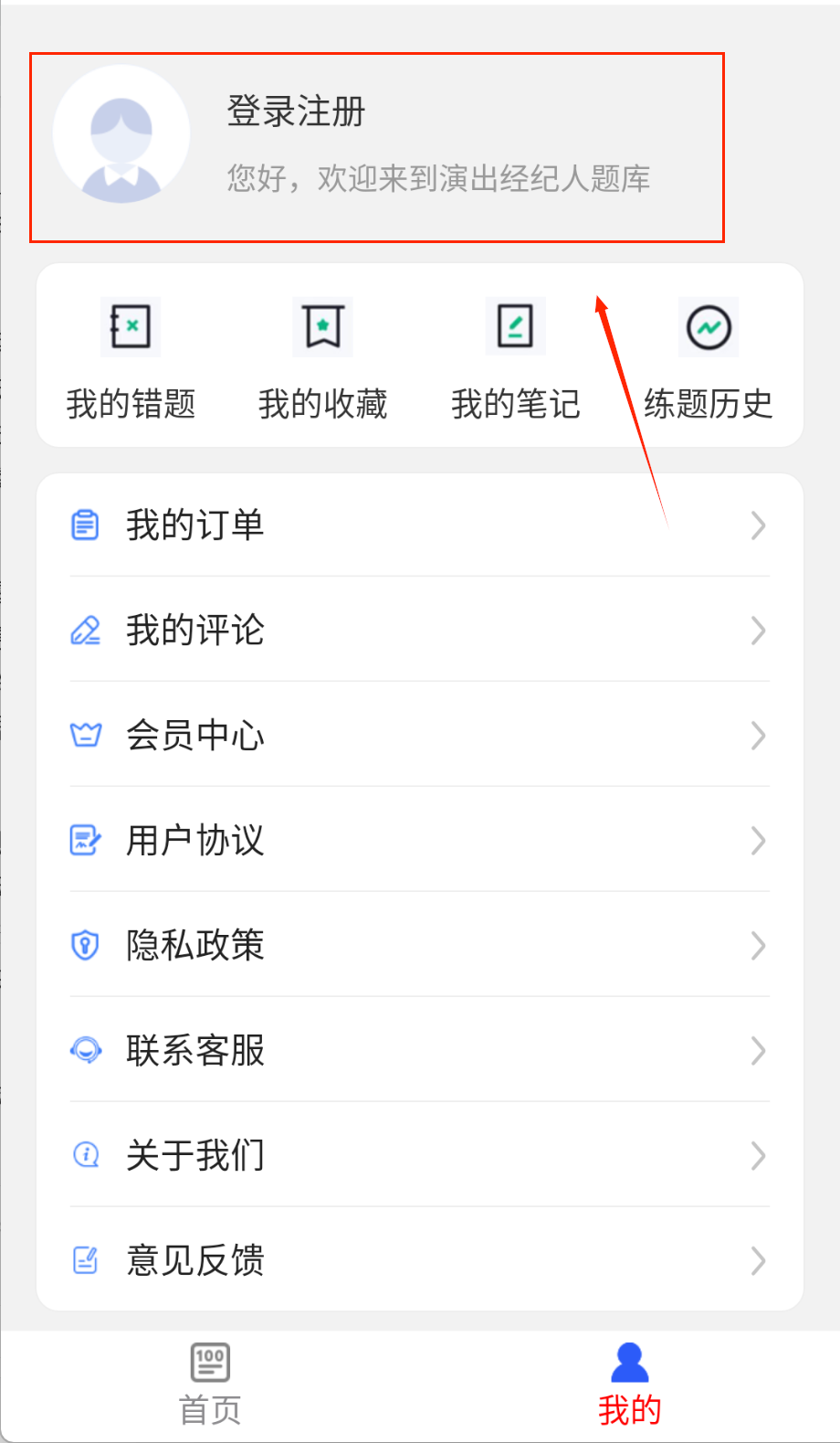 1、首次登录需通过手机验证码完成注册流程,成功进入系统首页后可看到章节练习、模拟考试和错题本等核心功能分区。