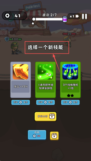 4、如何强化技能?进入"波次2/7"后点"选择一个新技能",优先点"政击+15%"即可提升输出继续战斗。