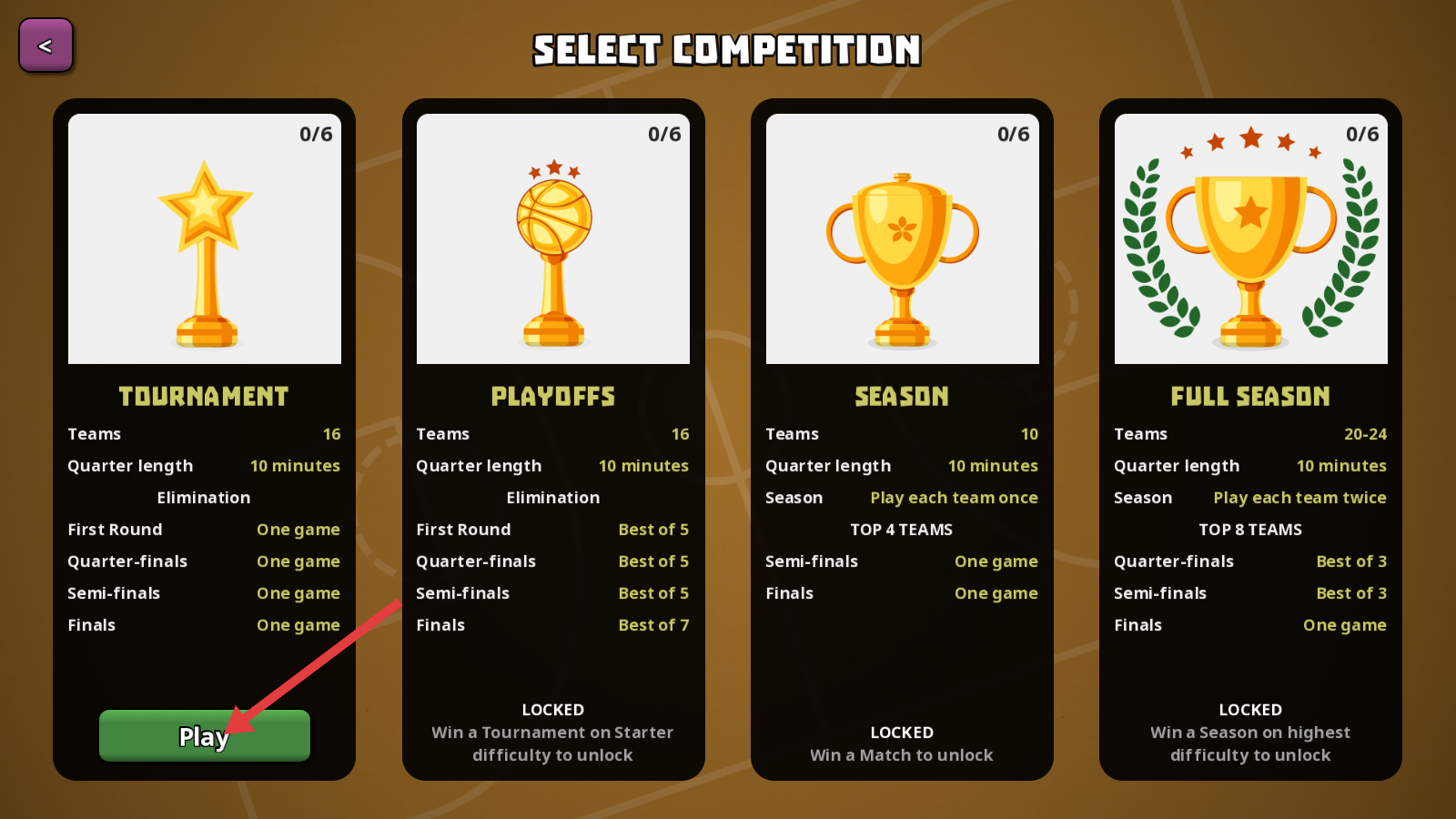 1、选择【TOURNAMENT】模式,点击绿色【Play】按钮开启比赛,该模式有16支队伍,每轮单场决胜,适合新手入门。
