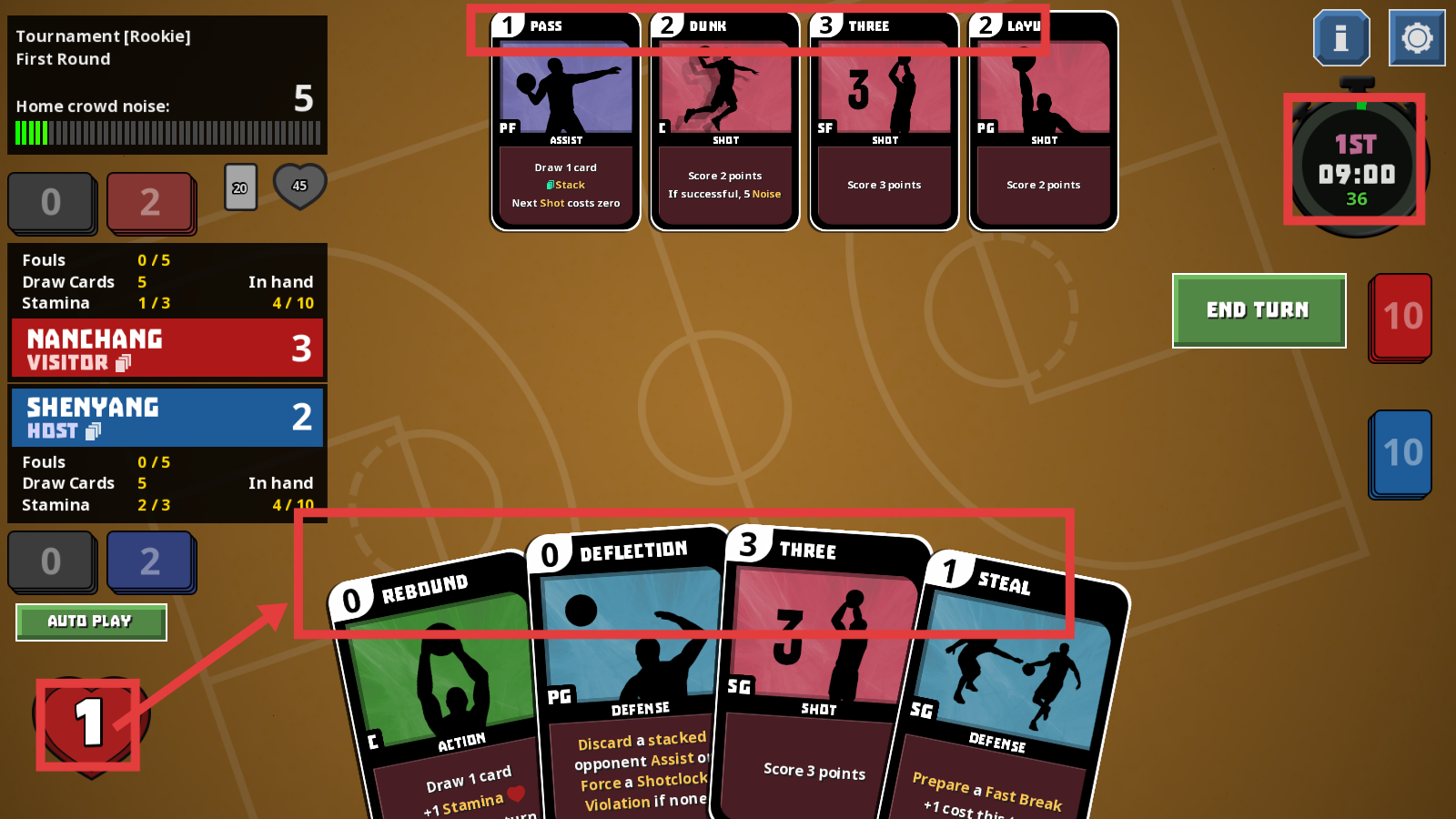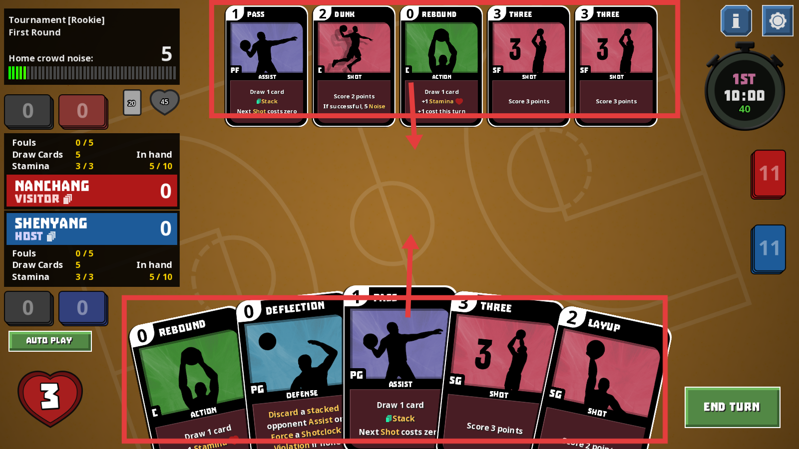 2、比赛中利用【PASS】【DUNK】【REBOUND】【THREE】等卡牌,根据卡牌效果选择传球、扣篮、篮板或三分投篮,推进进攻。