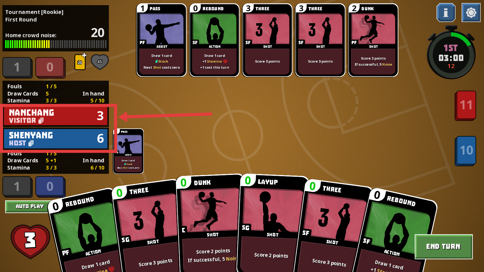 4、关注比分板,像【NANCHANG】和【SHENYANG】的比分,通过多次使用三分【THREE】等得分卡牌,帮助己方拉开比分优势。