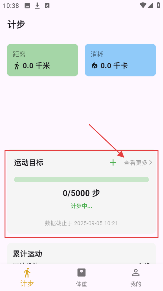 1、进入计步页,可查看距离、消耗数据,点击【+】能创建新运动目标,开启计步。