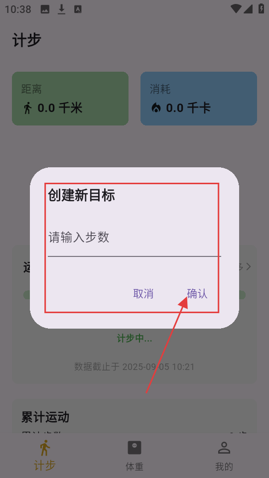 2、在创建新目标弹窗,输入步数后点【确认】,即可设定新的运动目标。