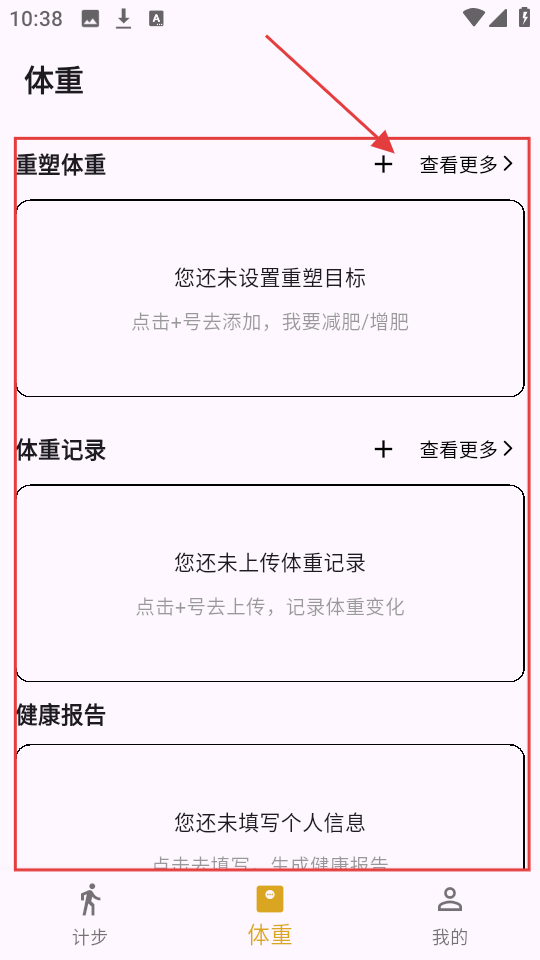 3、切换到体重页,可添加重塑体重目标、上传体重记录,还能填写信息生成健康报告。